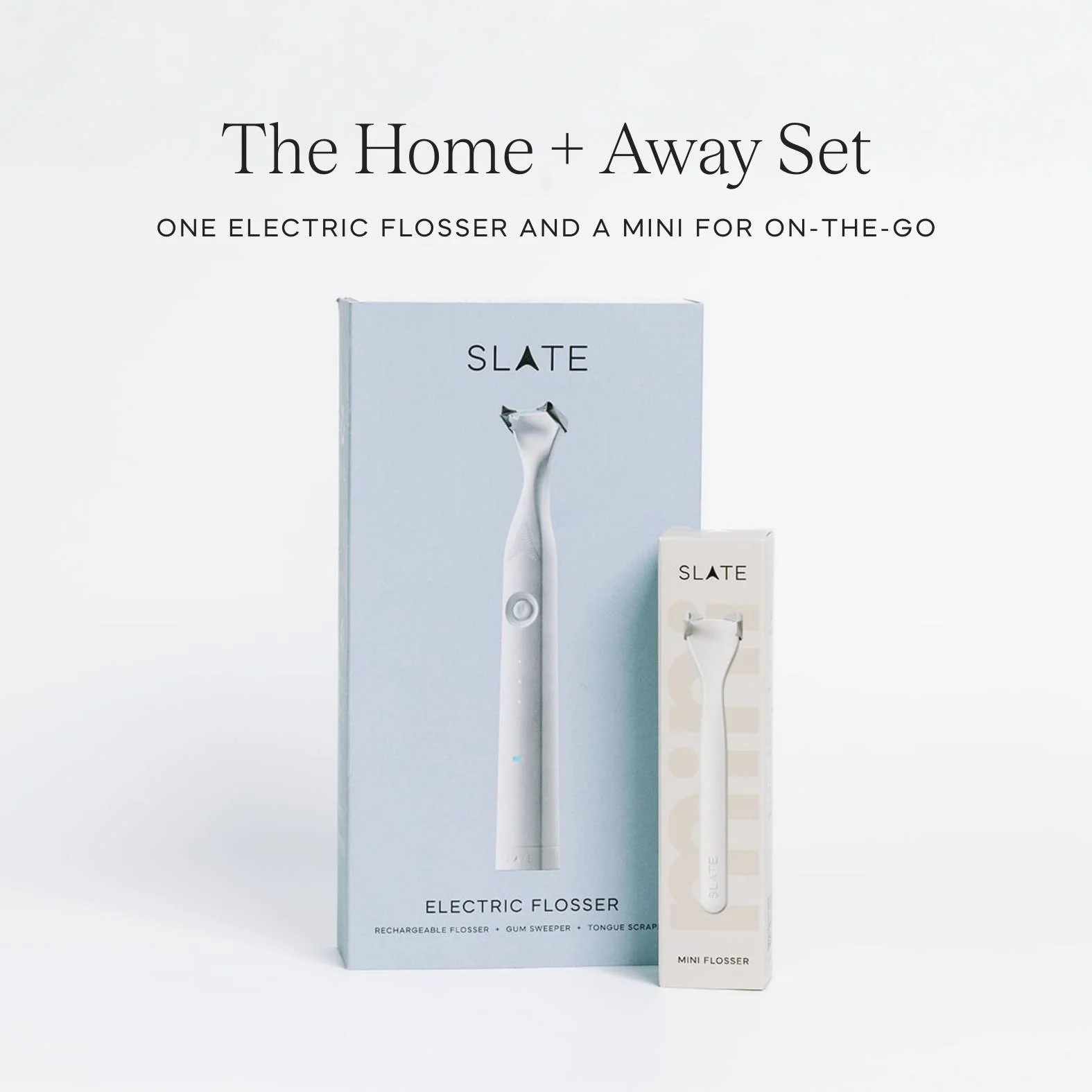 Includes: 1 Electric Flosser with 5 gray floss heads and charging cable, 1 White Mini Flosser with 2 white floss heads and 1 white floss head cover